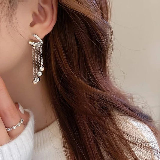 Yu Fashions Chain Tassel Silver Rhinestone High Fashion Extra Long Korean Earrings Pair