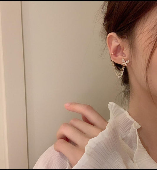 Yu Fashions Butterfly Pearl Rhinestone Chains Korean Earrings Pair