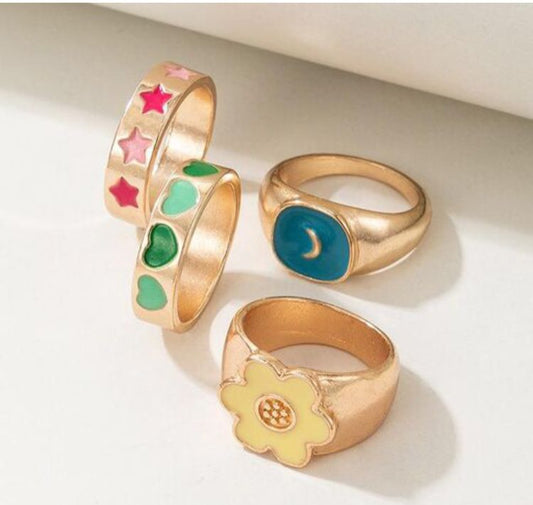 Yu Fashions Flower Heart Star Moon Y2K Multicolor Vintage Ring Set of 4