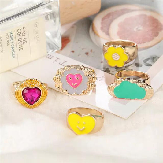 Yu Fashions Heart Cloud Flower Smiley Korean Ring set of 5