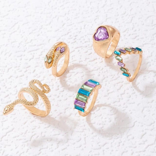 Yu Fashions Lavender High Fashion Snake Heart Crystal Korean Ring Set of 5