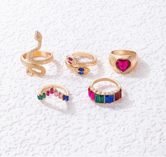 Yu Fashions Multicolor Crystal Snake High Fashion Korean Ring Set of 5