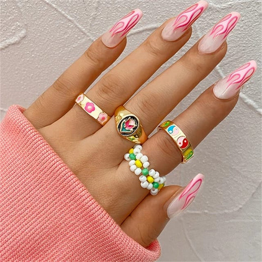 Yu Fashions Pearl Heart Y2K Flower Multicolor Vintage Ring Set of 4