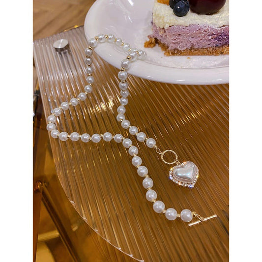 Yu Fashions Rhinestone Pearl Heart Pendent Necklace Pearl Chain