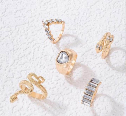 Yu Fashions Silver White Golden Snake Heart High Fashion Korean Ring Set of 5