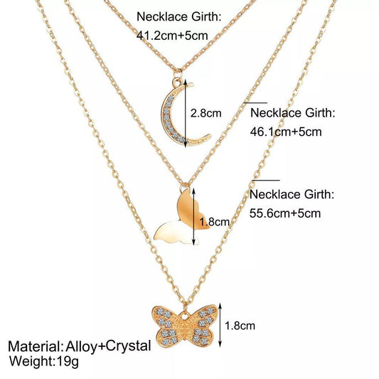 Yu Fashions 3 layered Rhinestone Moon Butterfly Multilayered Necklace Chain
