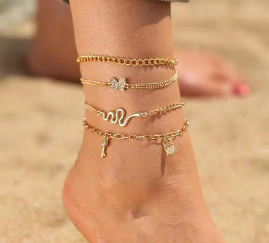 Yu Fashions 4 Layered Snake Rhinestone Butterfly Lock Key Multilayered Korean Anklet