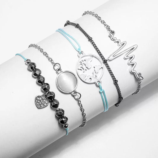 Yu Fashions 4 Layered Silver Boho Beads World Map Heart Multilayered Korean Bracelet