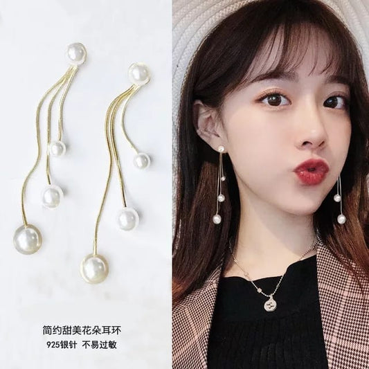 Yu Fashions 3 Pearl Drop Golden Tassel Korean Earrings Pair