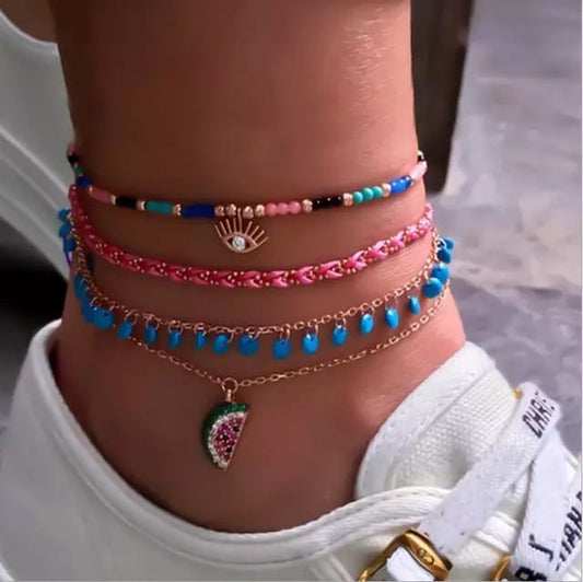 Yu Fashions 4 Layered Rope Half Watermelon Evil Demon Eye Blue Drop Beads Multilayered Korean Anklet