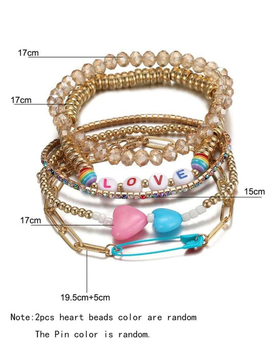 Yu Fashions 5 layered Love Safety Pin Heart Link Colored Beads Multilayered Korean Bracelet