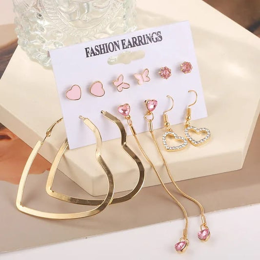 Yu Fashions Heart Golden Pink Crystal High Fashion Korean earrings Pair of 6