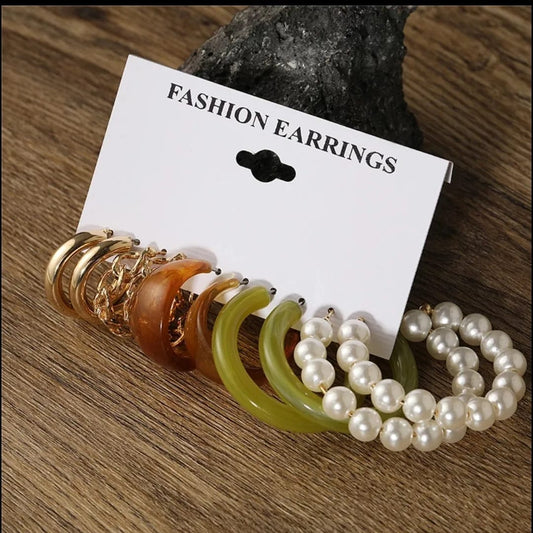Stylish Green Brown Golden Paerl Hoop Earrings Set of 5 Pairs For Women