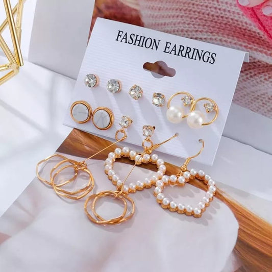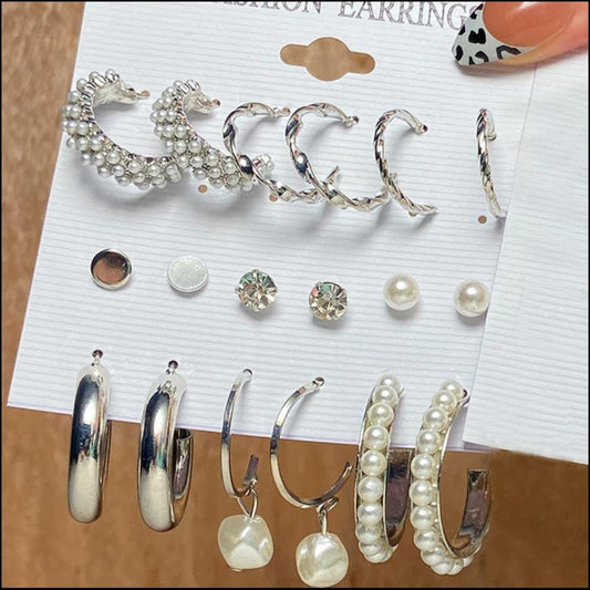 Stylish Pearl Drop Hoop Stud Earrings Set of 9 Pairs For Women