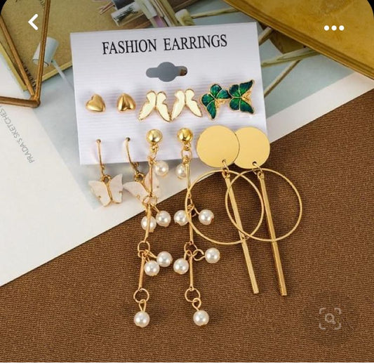 Stylish Green Golden Butterfly Geometrical White Earrings set of 6 Pairs For Women