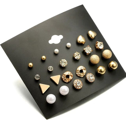 Yu Fashions Cute Golden Stud Stone Crystal Heart Pearl Korean earring Set of 12