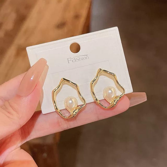 Yu Fashions Golden Melted Geometrical Pearl Korean Earrings Pair