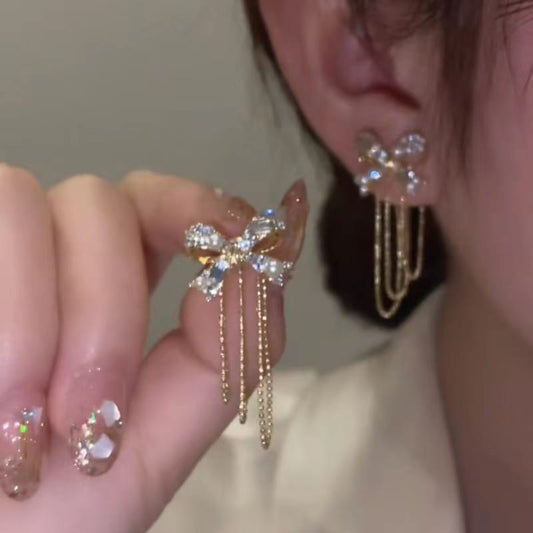 Yu Fashions Bow rhinestone Drop Tassel Korean Earrings Pair