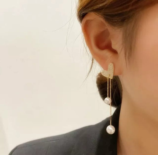 Yu Fashions Heart Shape Crystal Pearl Drop High Fashion Korean Earrings Pair