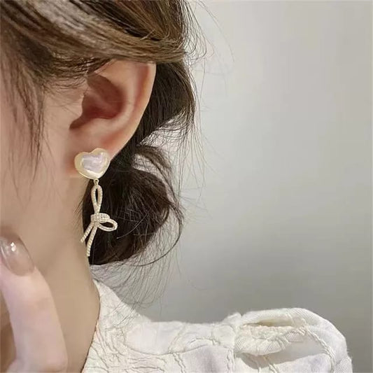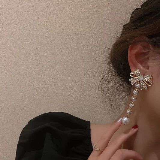 Yu Fashions Rhinestone Bow Knot Pearl Drop Trending Korean Earrings Pair
