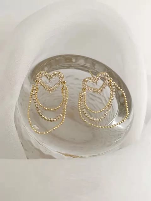 Yu Fashions Heart Shaped Rhinestone Drop Chain Tassel Korean Earrings Pair