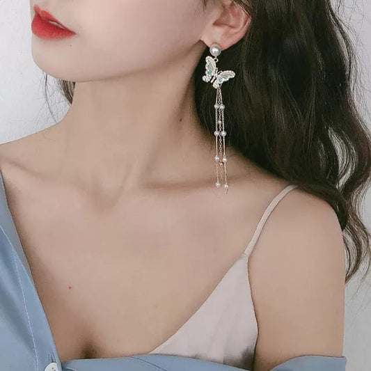Yu Fashions Green High Fashion Butterfly Pearl Tassel Korean earrings Pair