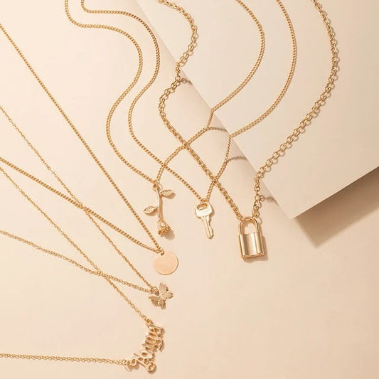 YU Fashions Multilayered Rose , Angel, key, Butterfly, Lock, Dot Korean Necklace Set of 6