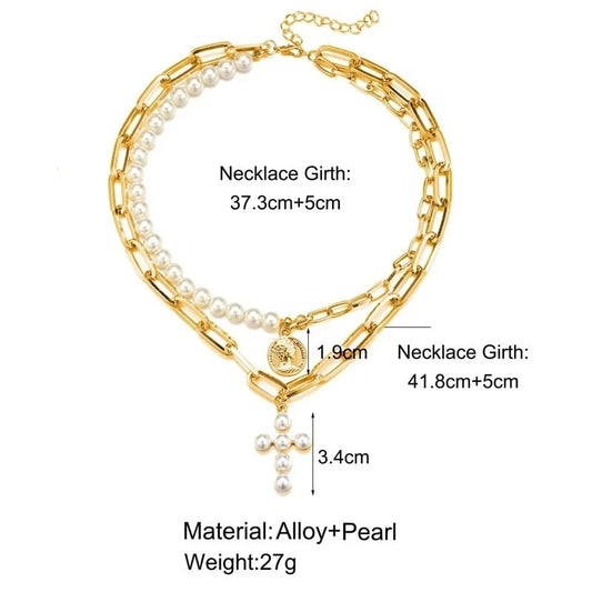 Yu Fashions Pearl Cross Pendent 2 Layered Necklace Chain