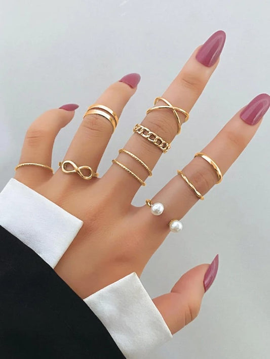 YU Fashions Pearl Link Golden Korean Ring Set of 10