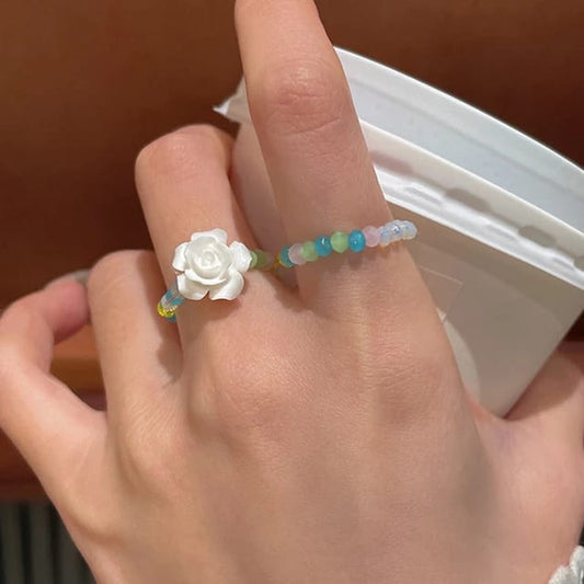 Yu Fashions Handmade White Beads Korean Ring set of 2