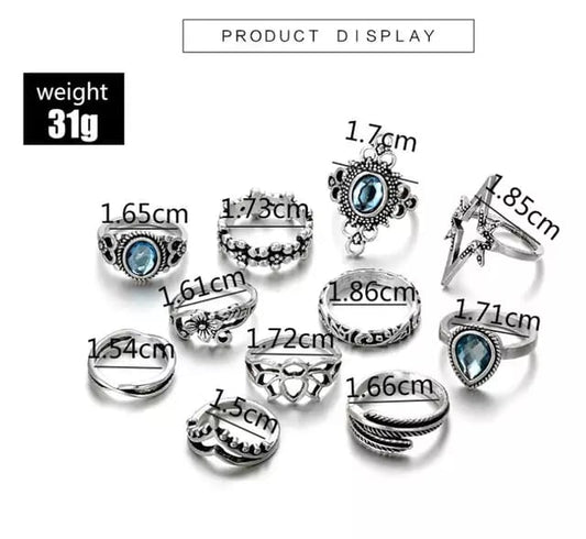 Yu fashions Boho Blue Lotus Floral Feather Cute Korean Ring Set of 11