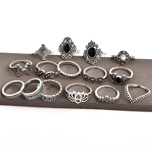 Yu Fashions Boho Black & Silver Boho Korean Ring Set of 15
